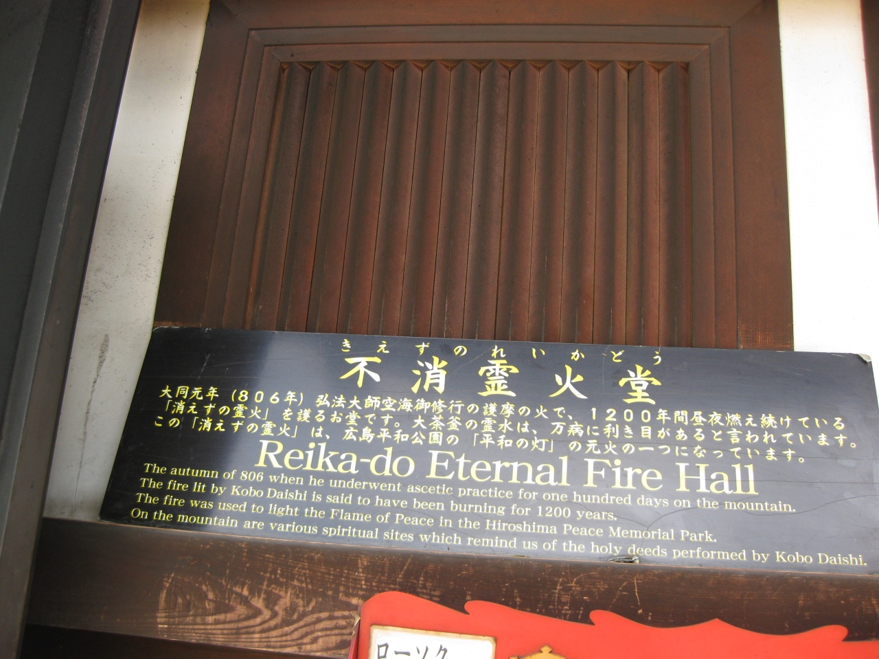 ロープウェイ頂上駅から10分程で着きます。1200年の間、火が途切れる事がないそうです。見る前は勢いよく燃えているのかと思いましたが実際は薪ではなく炭で火が起こしてありましたのでちょっとがっかりしました。
