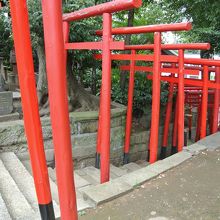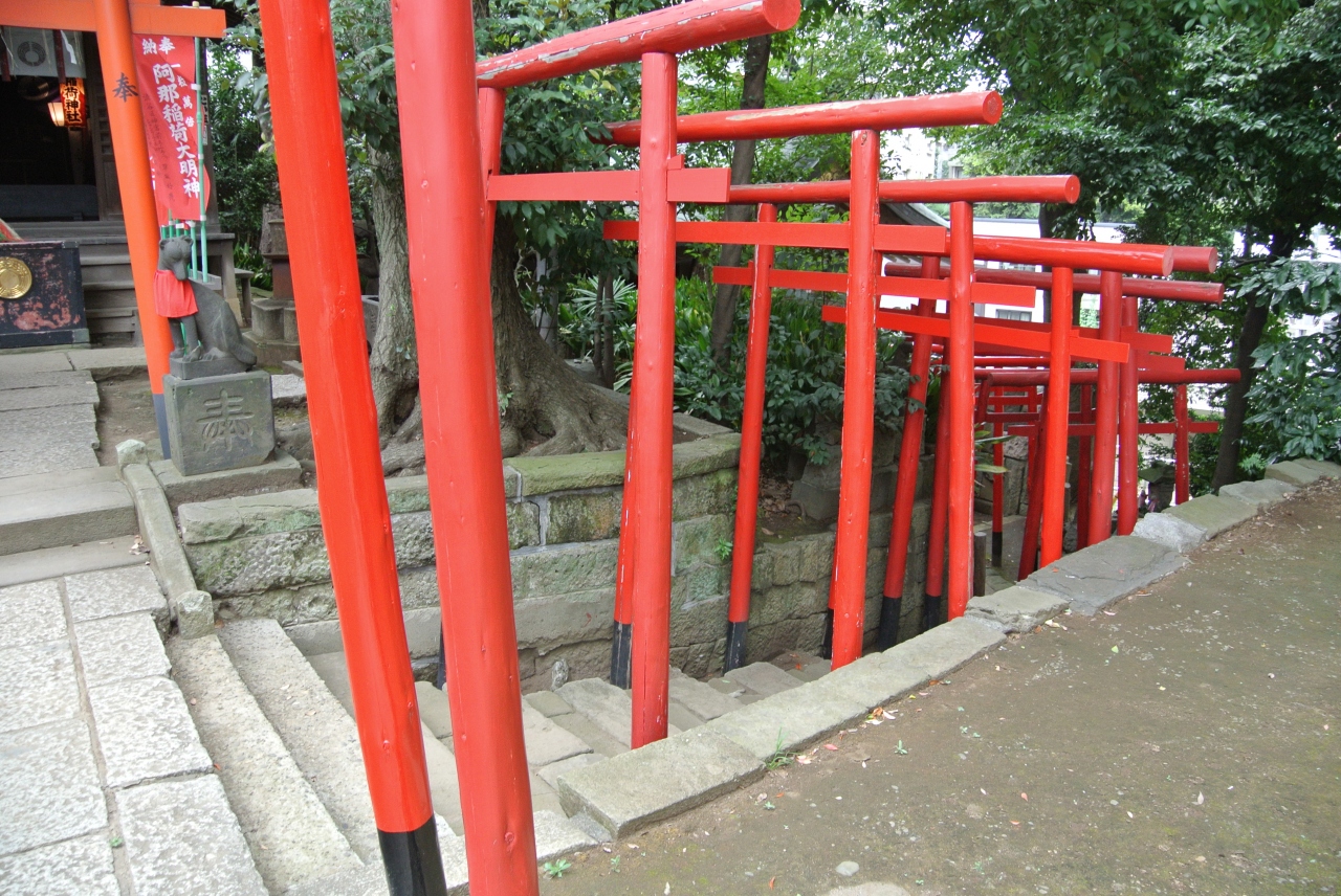 品川神社の境内摂社で、お社が二つありました。ひとつは品川神社の本殿の横、もうひとつはそこから階段を下りて行ったところです。小規模ながら赤い鳥居が連なって下って並んでいるのはちょっと見ごたえがりました。