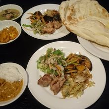 大きいナンがテーブルに運ばれ、ナンと共にカレーやサラダ、焼きそば、スープなどをたっぷり食べることができました。