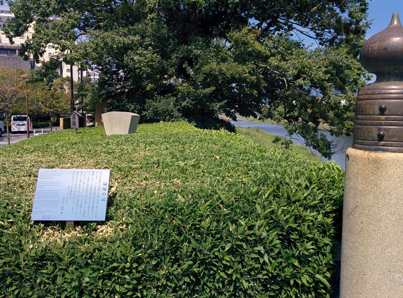 この「扇塚」には、「扇塚の記」があり、内容を確認すると、この「扇塚」は、「五条大橋の畔には時宗御影堂があり、一ノ谷の合戦で平敦盛が亡くなると、その妻は蓮華院尼と名乗り、寺僧とともにこの地で扇をつくった。」そうです。