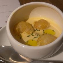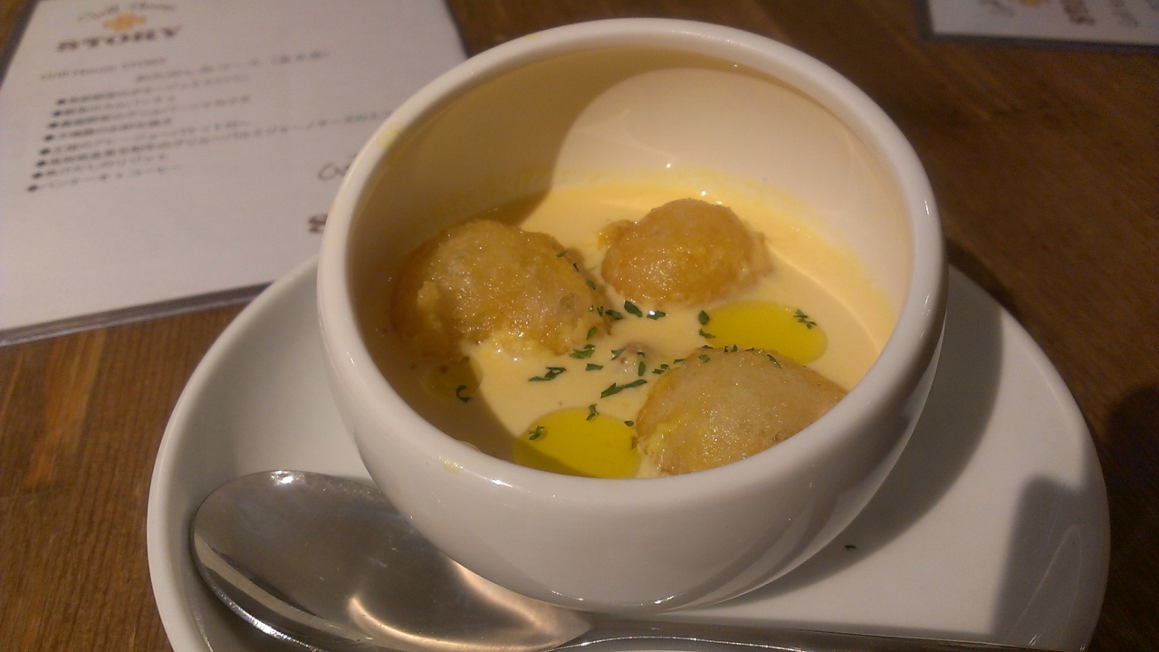 JR福島駅(大阪)、あるいは新福島駅から徒歩で3~5分ほど。オフィス街の細い路地に入ったところにあるレストランです。4000円ほどのコース料理には、サイコロステーキ、海産物のアヒージョ、カルパッチョ、冷製かぼちゃスープなどが付いており、どれも美味しくいただきました。