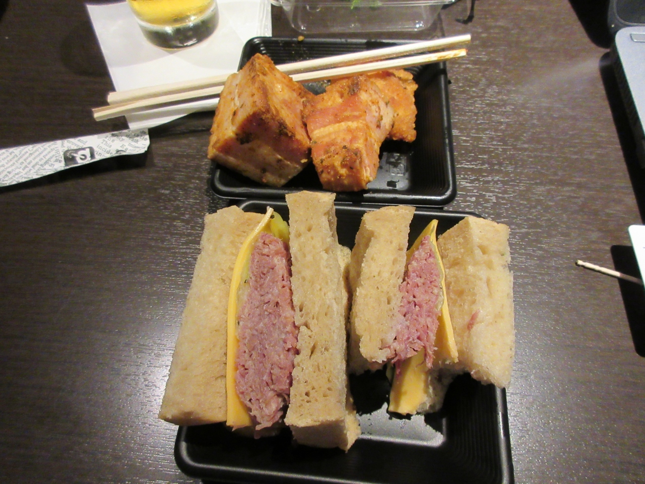 京成線から日暮里でJRに乗り換える必要があり、夕食をエキュートで買っていこうと除いてみました。ネットでここのコンビーフサンドイッチが美味しいとあったので、これと期間限定で売っていた厚切りベーコンを買いました。どちらも少量で500円くらいするので、少し逡巡しましたが、ビールを飲みながら食べると、良いおかずになって美味しかったです。特にコンビーフサンドは決して安くない値段にも納得のおいしさでした。