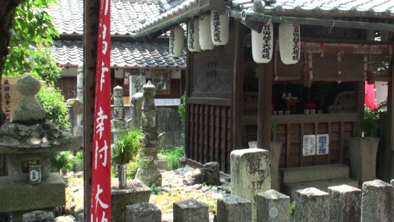ここは小さな村の中にあり、駐車場が無くバス停前か道の駅に置いての見学となる。真田親子の閑居した屋敷跡に建つ寺院となっている。門には六文銭の門が彫られ中に入ると登り端が賑やかに建っている。境内にあるお堂は善名称院と云う。その前に真田昌幸の地蔵堂と墓がある。他にはコレといった真田に拘わる資料は無い。