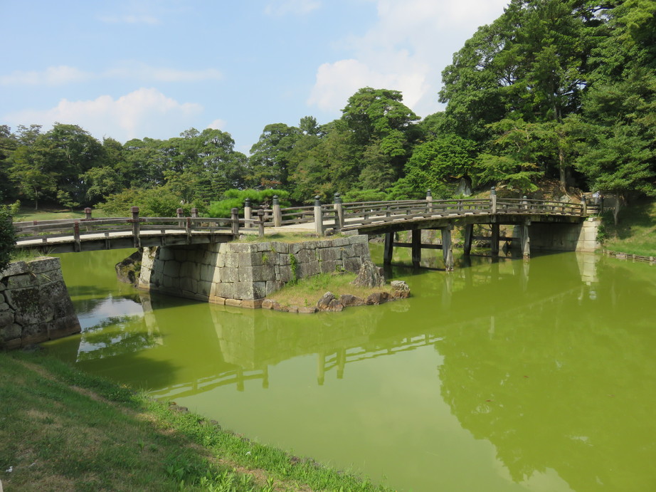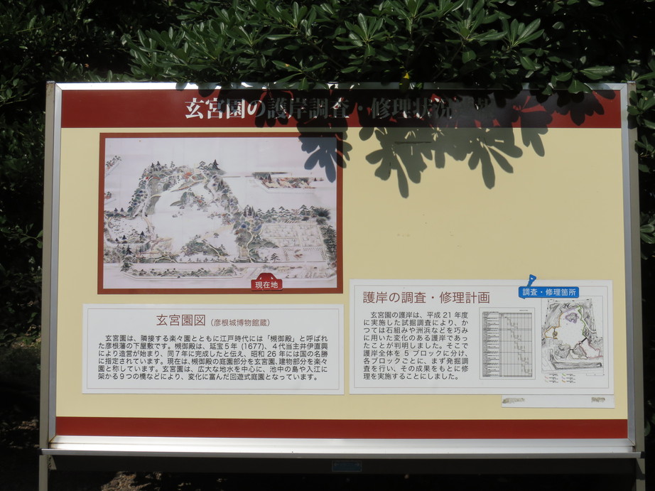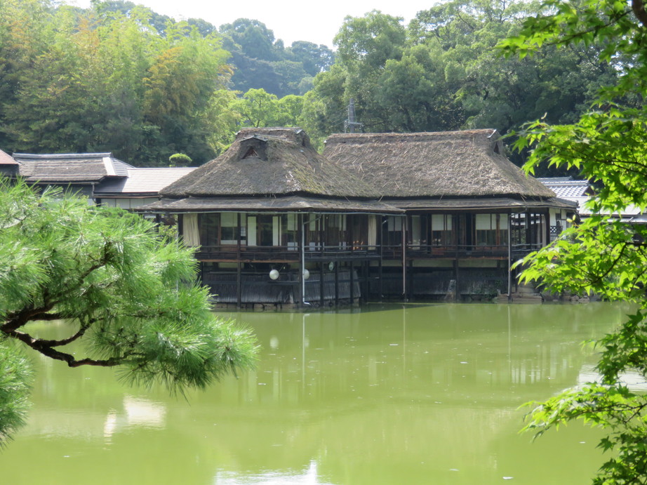 彦根城の入場券で一緒に入ることができました。中央に茶室が有り、周囲を散策しましたが、茶室がベストポジションですね。(当たり前ですが)水が苔の影響でしょうか、深いグリーンになってしまいコントラストが無くなっています。水の入りが細いのでしょうか、淀んでいる感じでした。