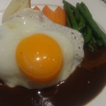 オムライスが食べたかったのですが、チキンが入っていたので断念。ハンバーグを注文しました。大きなハンバーグに黄身がとろりとした目玉焼きが載せてあり、添え物のお野菜やマッシュポテトも美味しかったです。