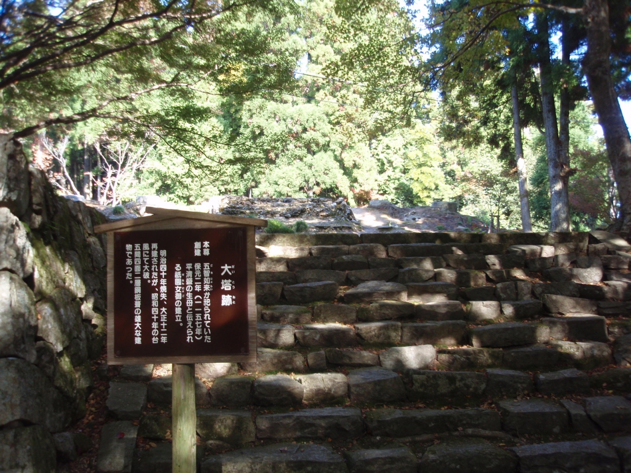 「コメント」階段をのぼりきると清水寺に到着。左手に本坊、客殿がある。本坊前から大講堂を見上げるところに、見頃の紅葉があり、なんとも言えない景観である。さらに階段を登ると大講堂の前に出る。大講堂の右手に放生池があり、そのさらに右手に薬師堂(本尊は薬師如来)。 大講堂裏手の階段を登ると右手に地蔵堂、左手に鐘楼がある。階段を登り切ると正面に根本中堂がある。根本中堂の奥の階段を登ると、法匡印塔があり、そこから左手に降りていくと「こんじょう水」がある(開山法道上人にいわれのある井戸)。少しもどり、根本中堂をさらに先に進むと大塔跡がある。(ここでの標高は556M)。礎石が配置されていた。ここから右手に降りて行くと仁王門に到着する。スタート地点の有料道路を進むと、ここにでる。 元きた道を本坊までもどる。