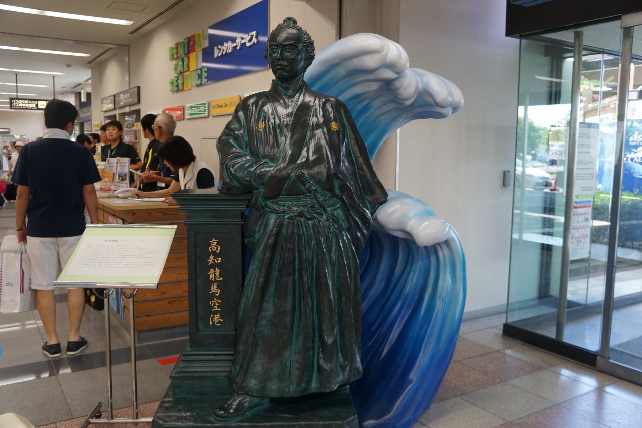 高知空港は、南国市。高知市よりも海に近いので、着陸の際は黒潮の流れる太平洋がよく見えます。一方、龍馬空港というのを積極的にアピールしている感じはあまりないかも。入口に中くらいの龍馬像が置いてあるくらいでした。