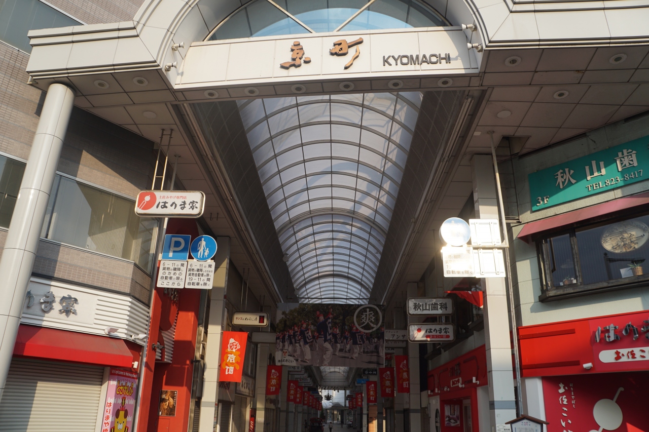 京町・新京橋商店街は、はりまや橋交差点から西に延びる商店街。大通りを挟んだ東側がはりまや橋商店街です。入口辺りのちょっとしたお土産のお店や中ほどにある土佐料理のお店が目立っていますが、京町・新京橋商店街を抜けると大丸百貨店、中央公園。そのまま帯屋町商店街にも至るので他の商店街との一体性も十分確保していると思います。
