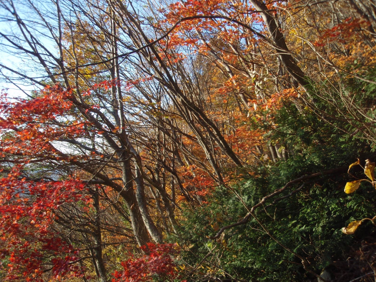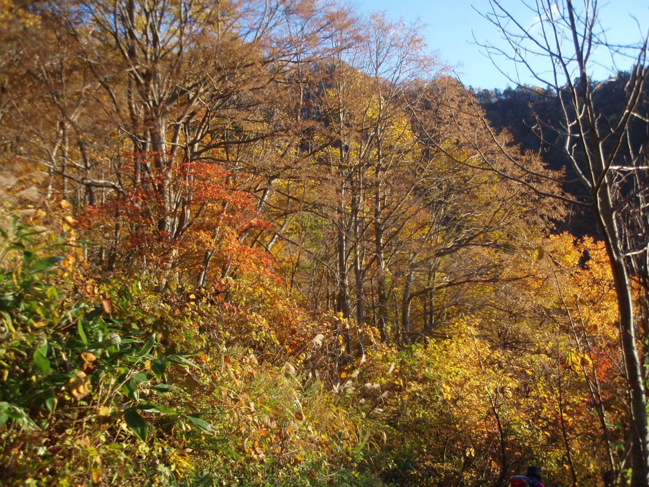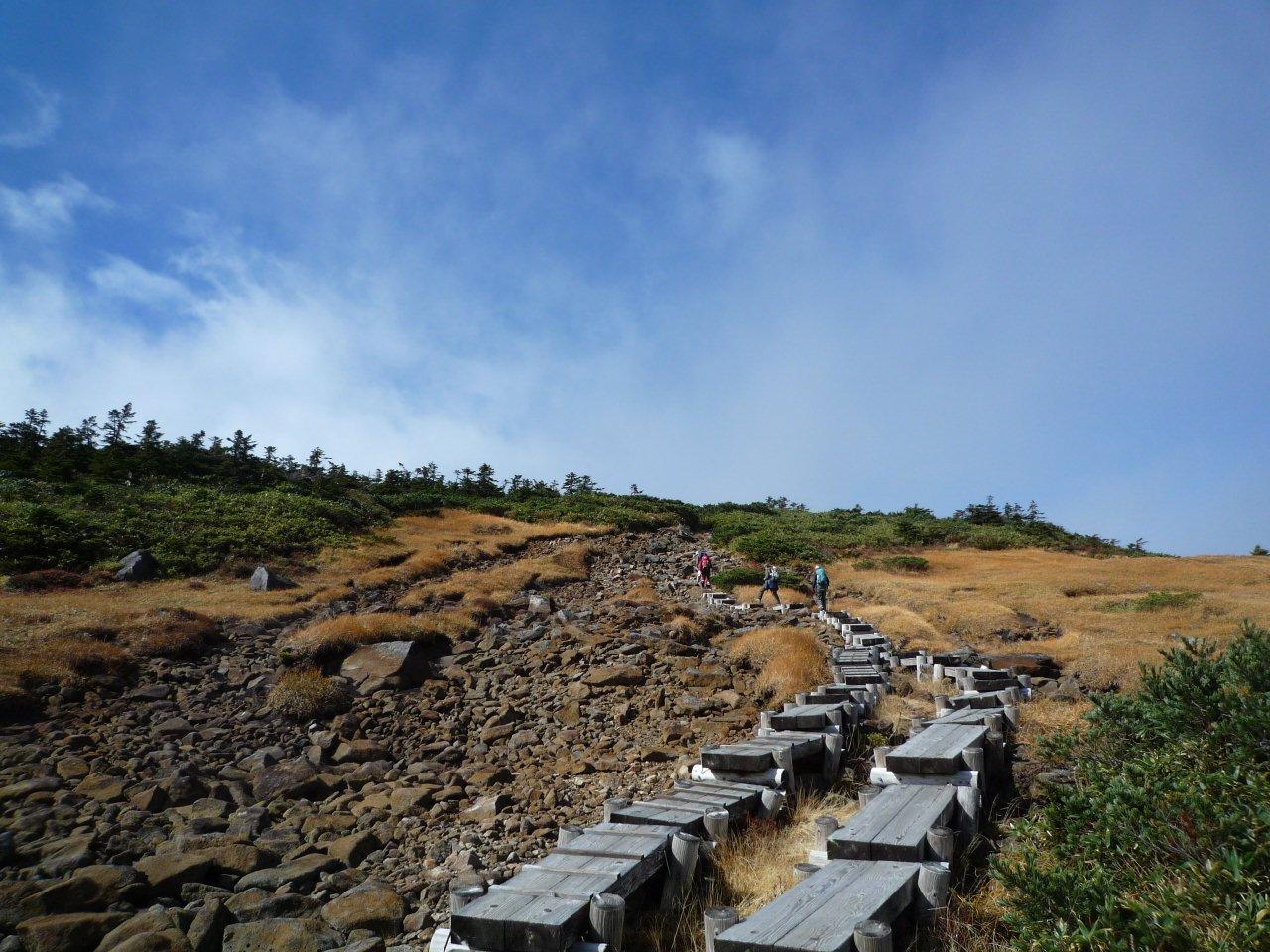 3本のリフトを乗り継いで、北望台から2時間半で山頂に登れる。ロープウエイから遠くに見える錦秋、大凹のお花畑に見る草紅葉、ロープウエイ天元台から新高湯温泉に向かう登山道で出会える紅、黄色の紅葉は今が真っ盛りで見事である。