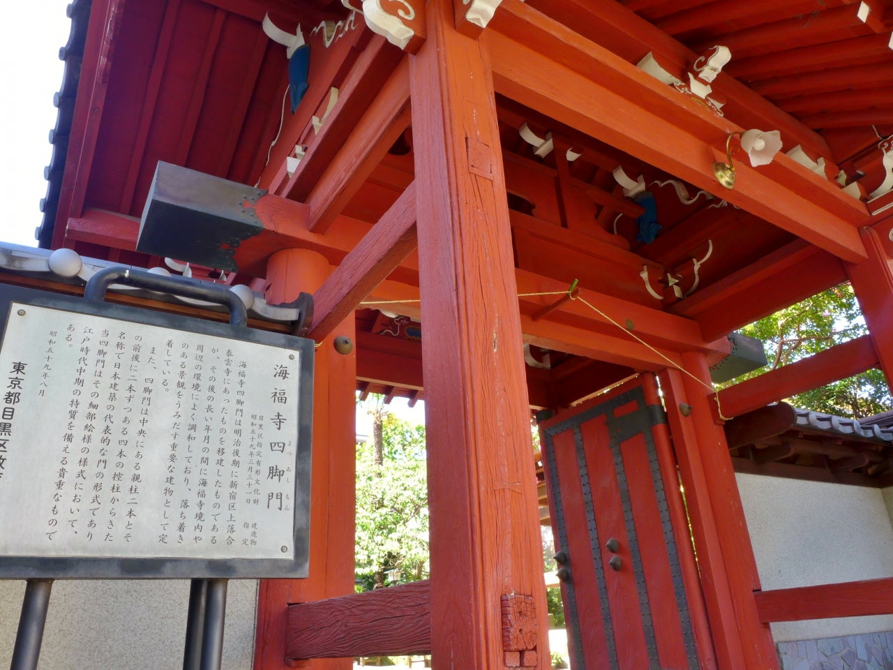 このお寺の朱色に塗られた山門が四脚門と呼ばれています。もとは新宿区上落合のお寺にあったものを明治後期にこちらに移建したそうです。