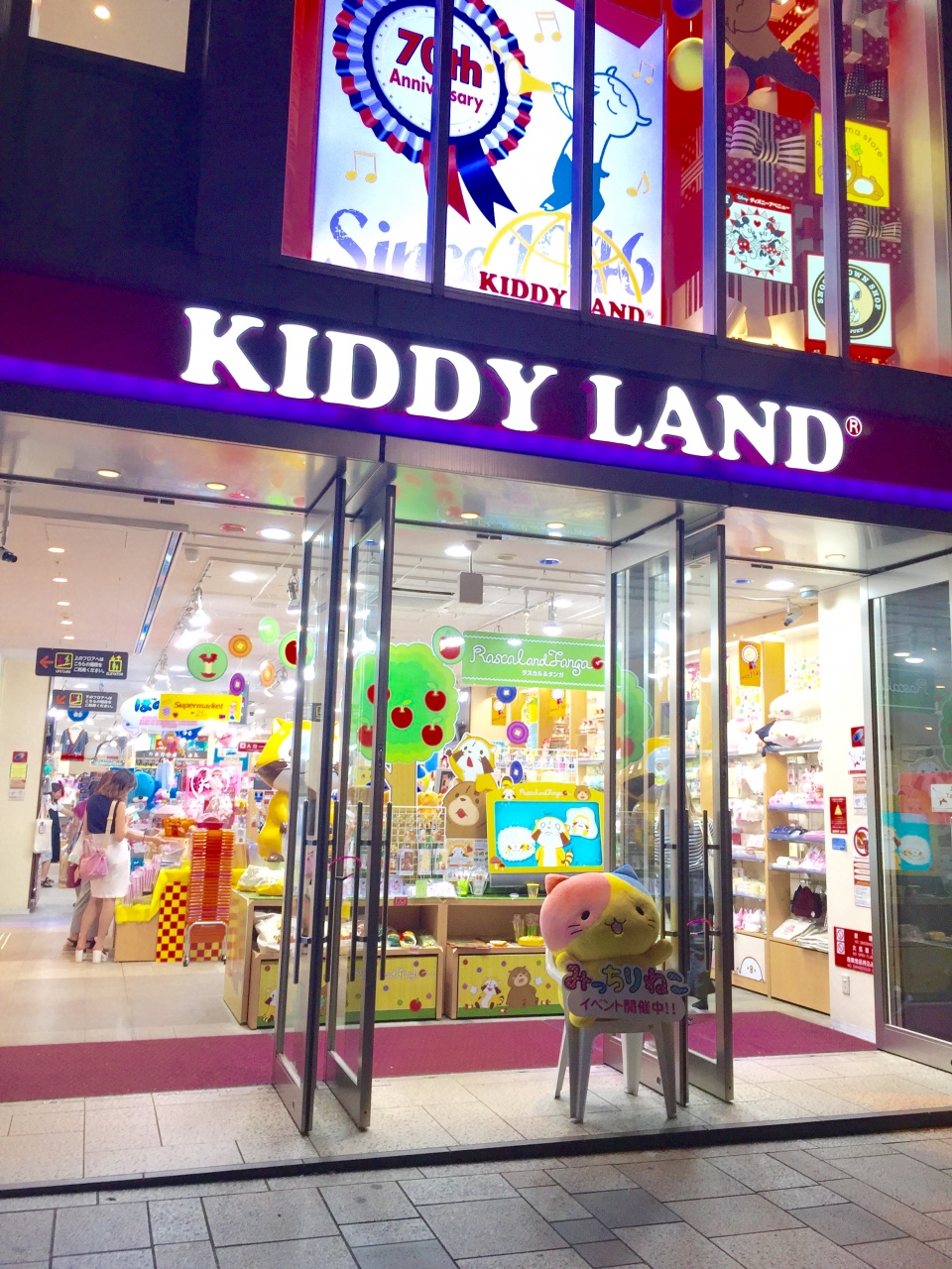 もはや原宿の観光名所の1つキディランド!土日は海外からのお客さんでいっぱいです。それに加えて土日は毎週のようにイベントをやっているので大行列ができています。ふなっしーグッズは凄い種類です、ふなっしーに直接手紙が出せるポストもありますよ~。あの辺りで明治神宮前に向かって並んでいるのがアイスモンスター かき氷屋さんの列で、表参道向きで並んでいるのは、何かの限定キャラクターグッズです笑 気を付けて下さい! いつも人だらけですが平日の夜は、かなり見やすいです、おもちゃは もちろんですが、キディランドは最新キャラクターグッズや文房具がたくさん置いてあります。フチ子シリーズや思わず集めたくなるシュール大人がちゃがちゃなど 疲れてる人は、ぜひ癒されに行ってください(^ー^)ノ