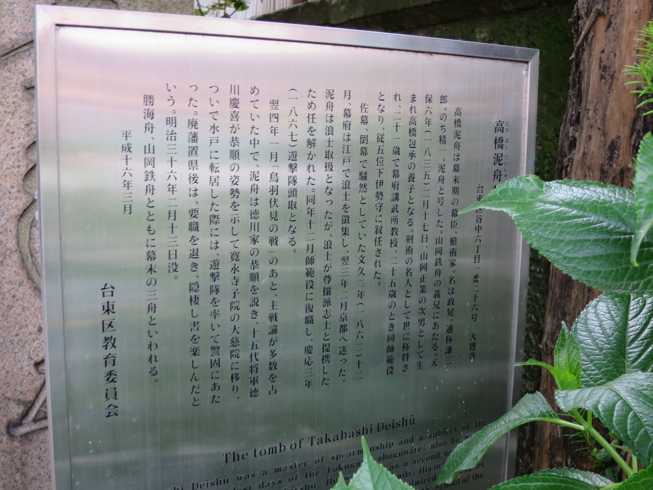 入口から中を覗くとヒマラヤ杉と同じ位大きなクスノキが境内を覆うように茂っており、その下に、幕末期に活躍した槍術家 高橋泥舟(山岡鉄舟の義兄)の墓があります。幕末三舟の一人ですが、こじんまりとした墓で少し驚きました。
