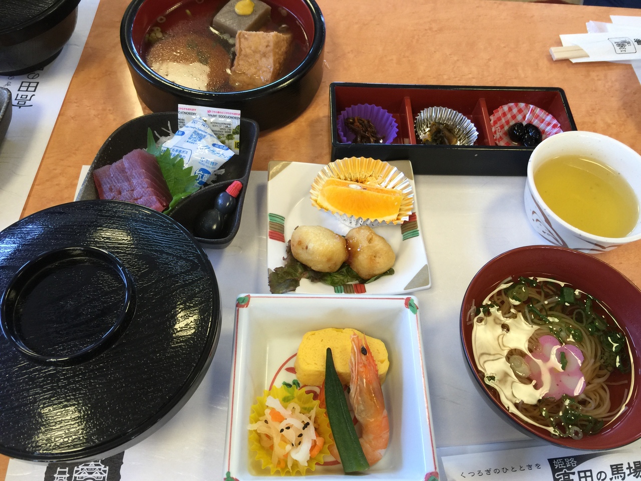 姫路城の前にある高田の馬場へ。ここでのお食事は、そうめん、おでんなどなど。そしてご飯の上には、お土産で売られてるうにの漬物?を乗せてくれた。これがとっても美味しかった。おばちゃんたちの流作業感が半端なかったけど、関西っぽいところもあって楽しかった。