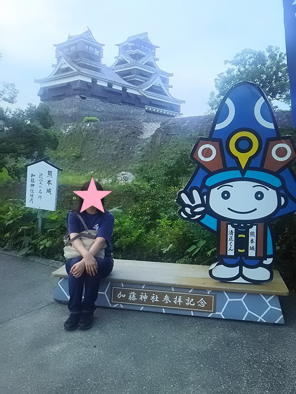 境内には場所には熊本城の記念撮影スポットがあり、屋根瓦が落下した状態ですが、凛々しい姿の大小2つの「天守閣」をバックにした写真が撮れました。