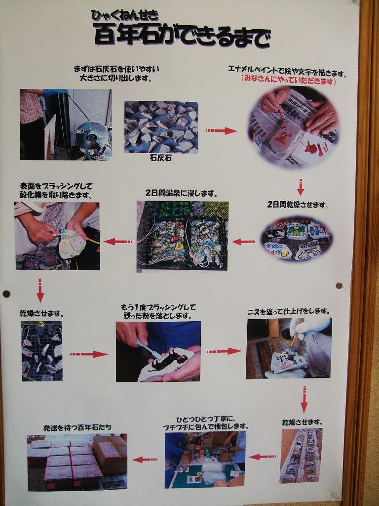 石灰石に、ペンキで文字や絵を描いて、温泉水に5日間浸します。強酸性の温泉水が石灰を溶かすため、ペンキで描いた部分だけ浮き上がって、世界で一つだけの作品が出来上がります。