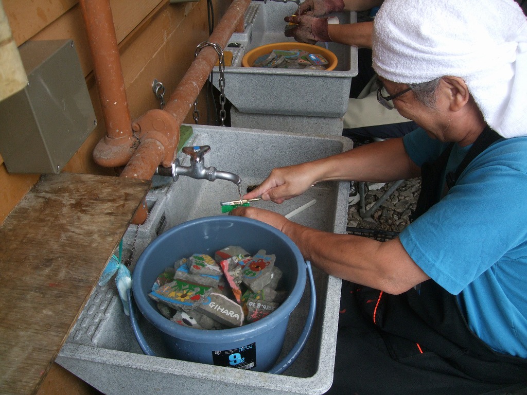 説明を聞いてからペンキで描いて、着払いの伝票を書いたりして、1時間くらいかかります。温泉水につけたり洗ったり、宅配による発送は係りの人がやってくれます。無料でできて、楽しいです。