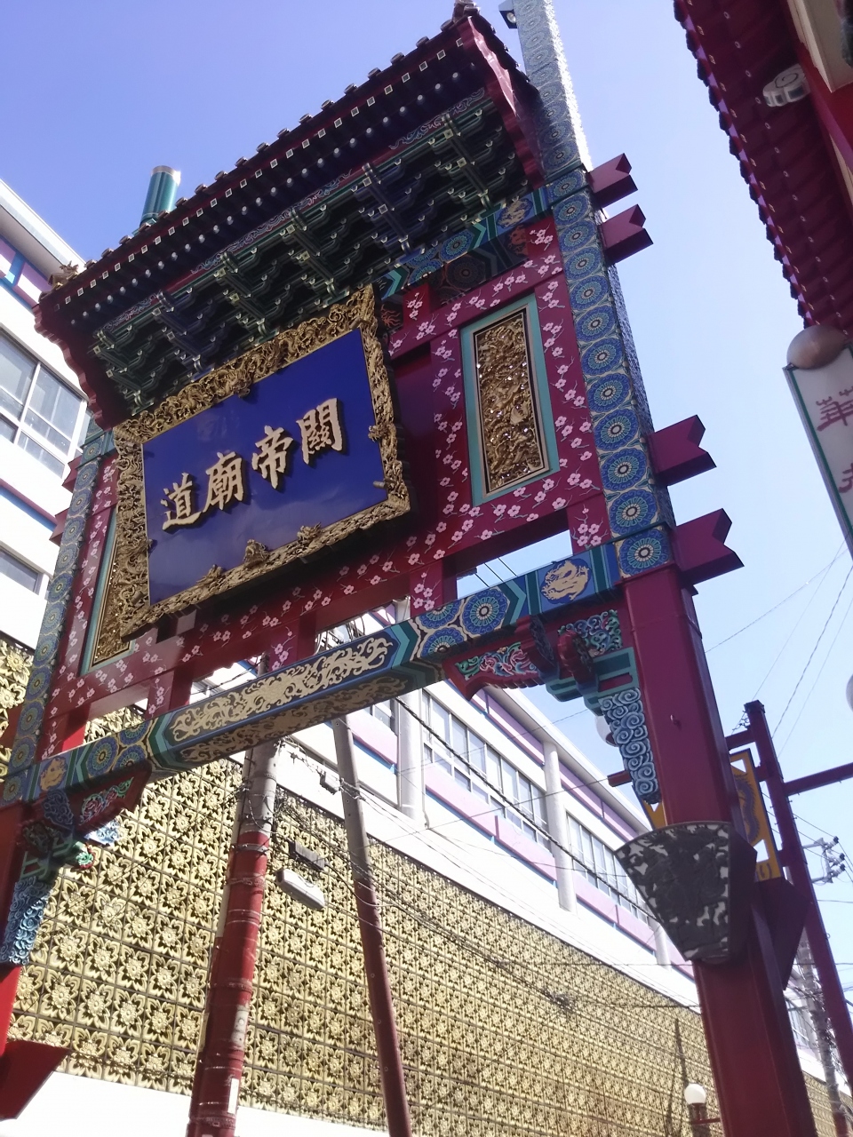 関羽をまっています、門から、関帝廟までは10分かからないくらいです。門のとおり関帝廟もオレンジ色が装飾されとても派手な面持ちです。商売の神様として、参拝することもできます、いつも人だかりができています。この門からゆっくりと景色をたのしみがら散策が出来ます