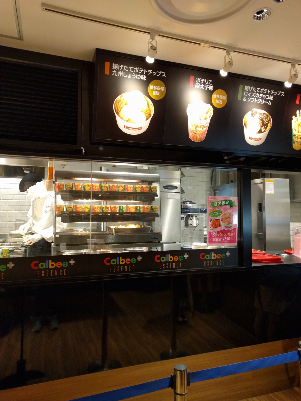 「カルビープラスエッセンス 博多阪急店」を見つけ、現地でしか食えないのにした。並んで待つこと15分、ポテりこの明太子味だ。出来立てが食えるのがいいのと、値段が安いのが嬉しい。明太子いいねー!名古屋にないのが悲しい。味噌味でもうまそうだが。