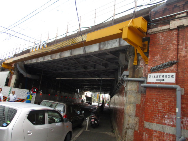 JR神田駅西口から新石橋架道橋を渡り線路沿いを東京方面へ歩いて5分ぐらい本銀橋架道橋と龍閑橋架道橋の間にJR線路の高架部分第1本銀町橋高架橋です。第1本銀町橋高架橋は1919年開通の鉄筋コンクリート建築で関東大震災に耐えた頑丈な高架橋で赤レンガの壁面はかなり傷んでますが広範に残っていてレトロな雰囲気を感じます~