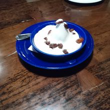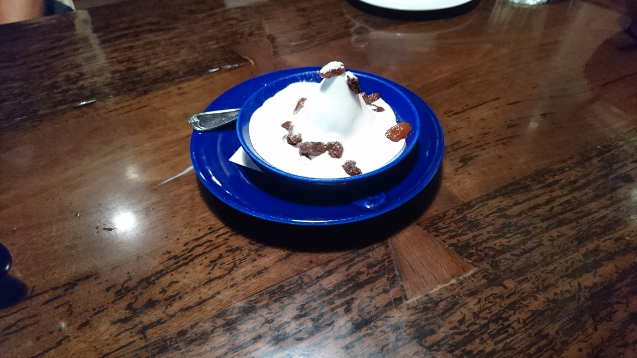 せっかくなので食べてみましたが、クリームチーズで山の形を作り、そこに砂糖なしの生クリームをかけ、粉砂糖とレーズンを乗せただけのものでした。