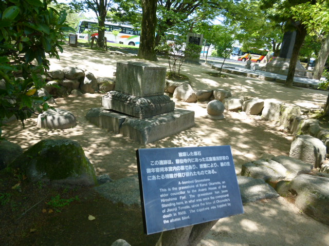 今日は広島の平和記念公園を散策しています。この「被爆した墓石」は「平和乃観音像」付近にあり、どちらか言うと北西側にあります。戦後この辺一帯は、平和記念公園として整備され数多くの記念碑が建てられています。しかしこの「被爆した墓石」は戦後建てられたのではなく、もともとこの地にあった慈仙寺の墓石で、それが被爆しその墓石を設置されたようです。ちなみにこの地面は当時の地面のようです。