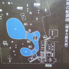 この場所は、明治から昭和初期にかけて、文人に愛された「東屋」という旅館のあった場所だそうです。配置図を見ると、海のまである広い敷地には池があって、その池の周りに離れがあったり、なかなか贅沢なつくりの旅館。