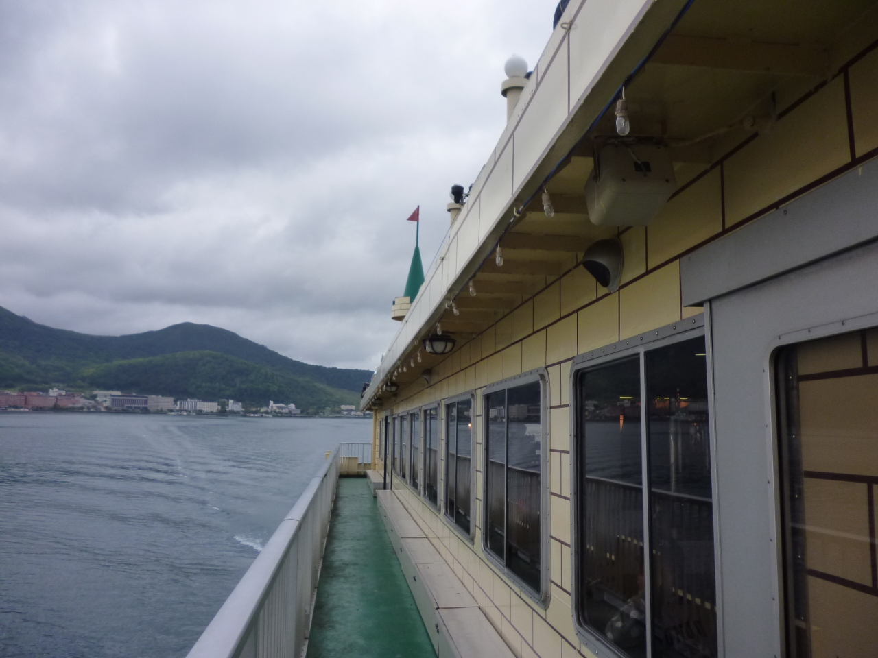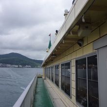 中島の近くまで洞爺湖を周遊します。3階のデッキに出るとカモメがやってきました。洞爺湖に浮かぶ島々や、昭和新山の赤い岩の山肌がよく見えました。有珠山の頂上には雲がかかっていました。のんびりとした遊覧でした。