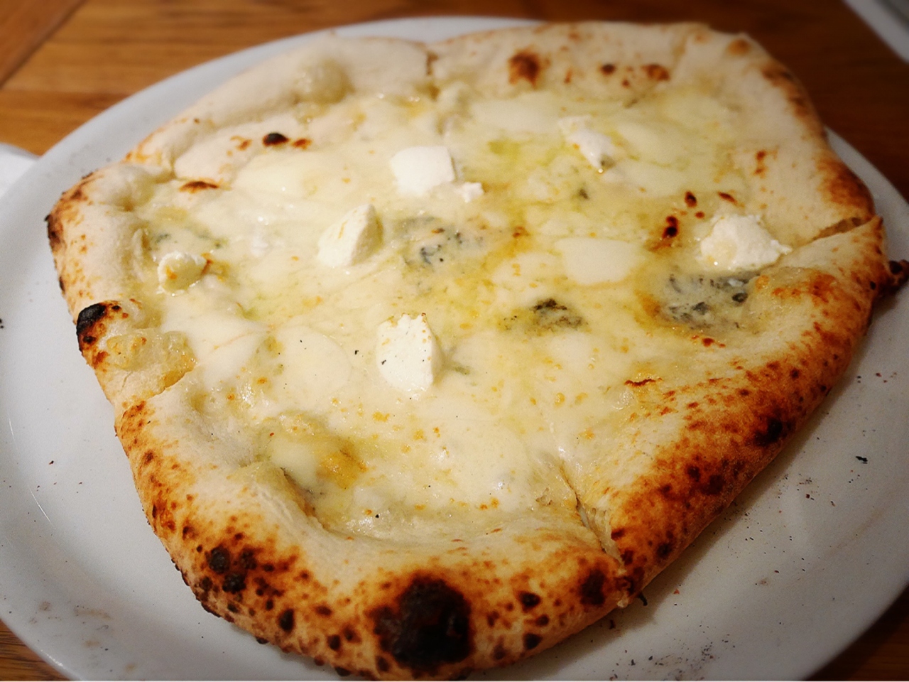 気まぐれピッツアは、クアトロ・フォルマッジ+燻製チーズの5種のチーズピッツアです。