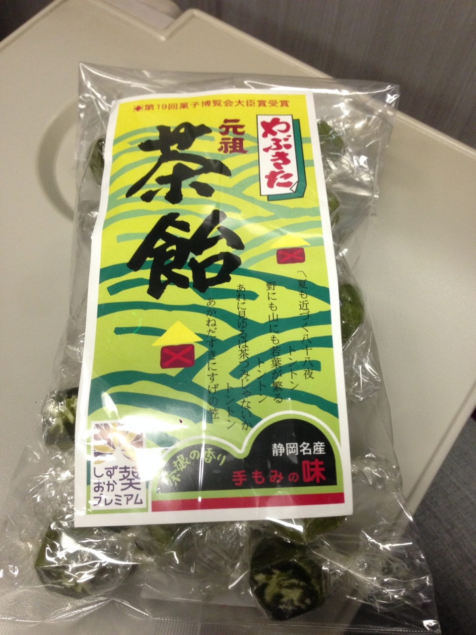 静岡土産の定番お茶を使った昔ながらの飴で、原材料はグラニュー糖と水飴と抹茶のみ。口に入れるとお茶の良い香りが広がり、心地よい少しの苦味と飴の甘さが広がりました。食事の後はミント味で口直しが定番ですが、お茶味もすっきりして良いです。