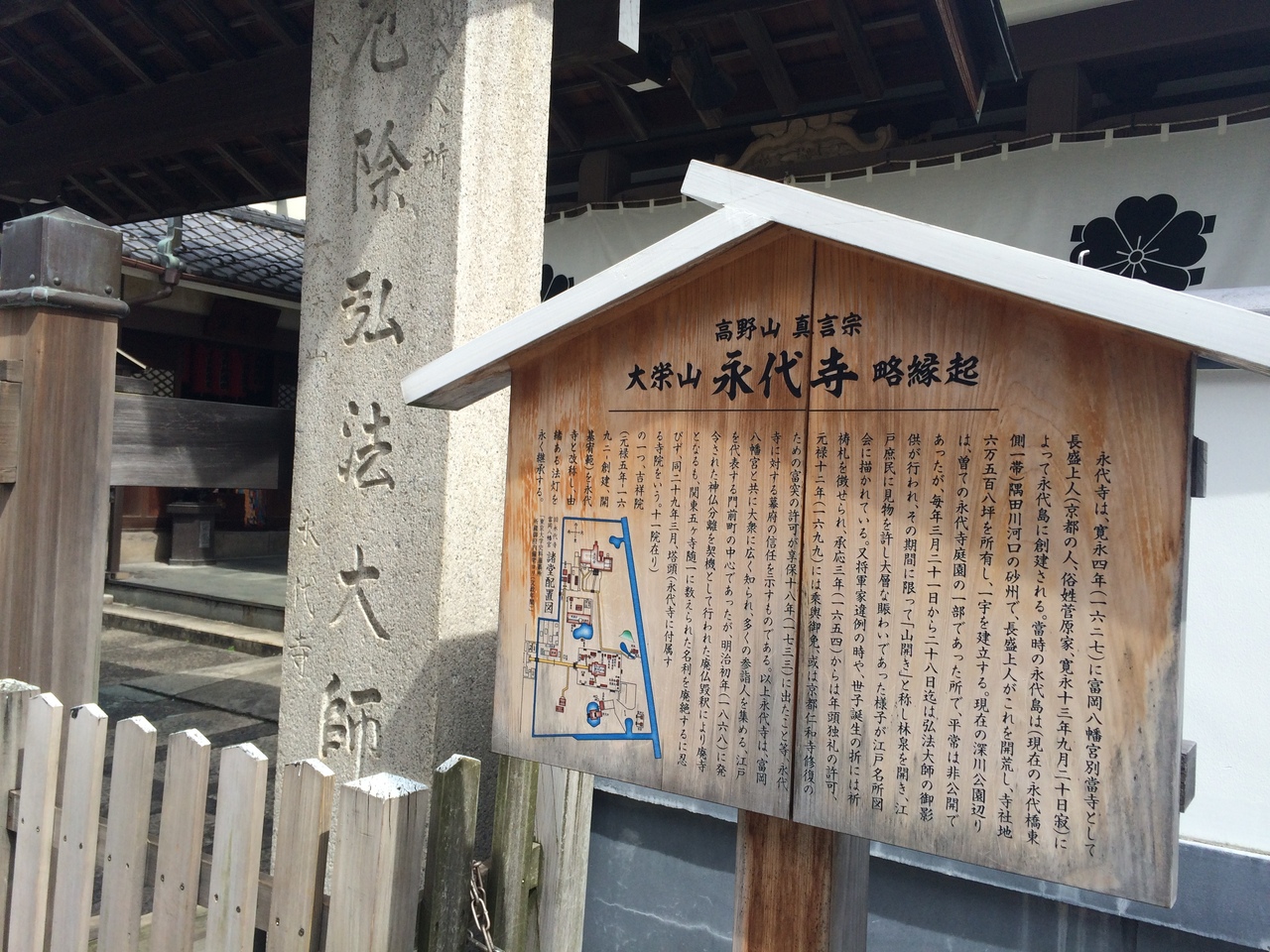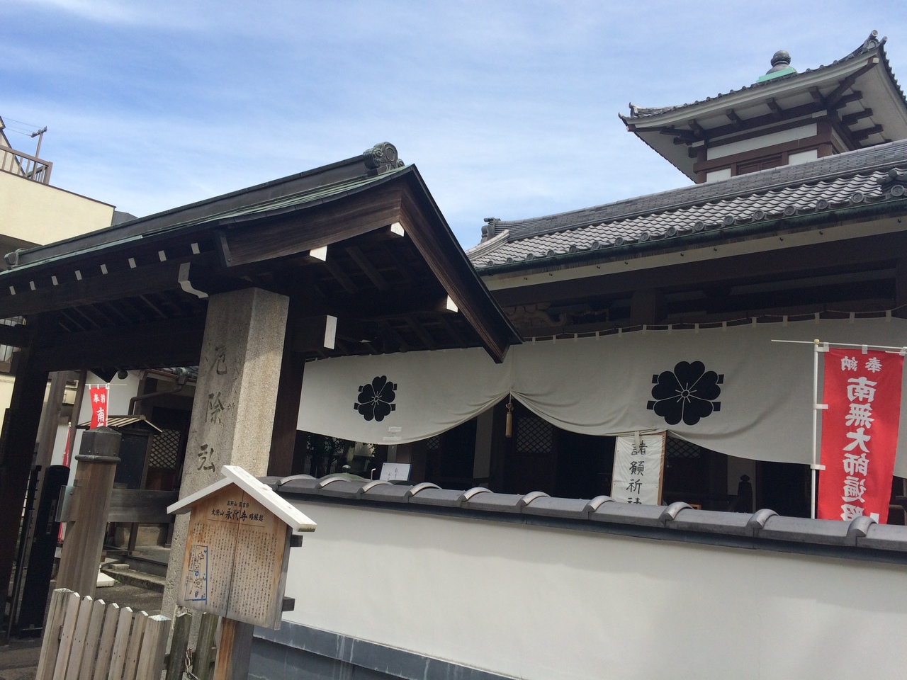 深川不動堂の門前の通りにある小さな寺ですが道から直ぐに入ることが出来るので観光客が多く立ち寄っていました。境内は狭く入口には弘法大師に関する碑が建っていて目立ちます。入口の左右に奉納の赤い旗が立っています。