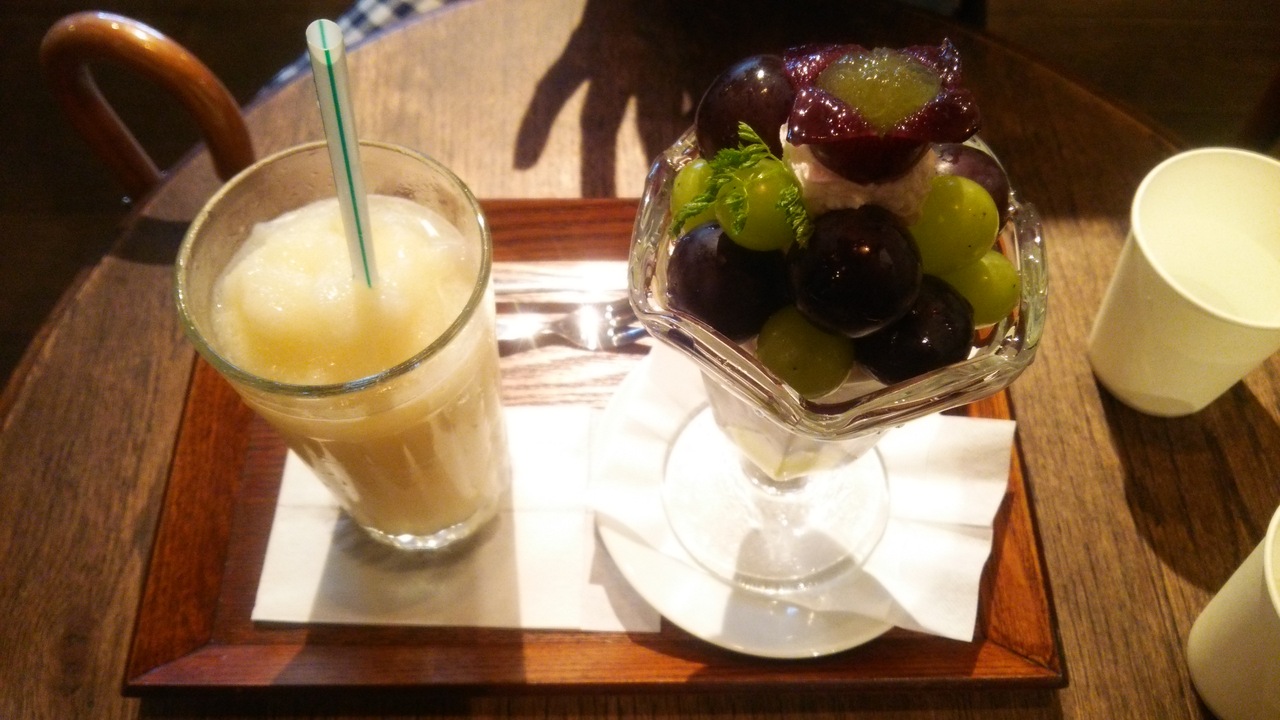 私たちはブドウパフェと白桃スムージーをカフェで頼みました。
