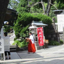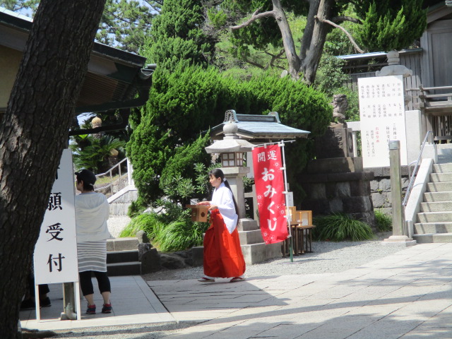 葉山の海岸から赤い橋が見えて、渡るとすぐにありました。素敵な建物の社務所を過ぎて鳥居をくぐります。お宮参りの赤ちゃん連れの正装の家族が、海遊びのラフな格好の参拝客の中で目立ちます。神前挙式やお宮参り、縁結びなどに強いみたいです。