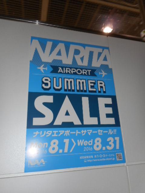 成田空港第2ターミナル駅(京成)からすぐの場所ですので、アクセスはいいですが、結構広いので、時間は多めに。お店も多いですし、展望デッキなどもあり、コンビニなどもあって、一通りいろいろそろっています。お店ではサマーSALEやってました。