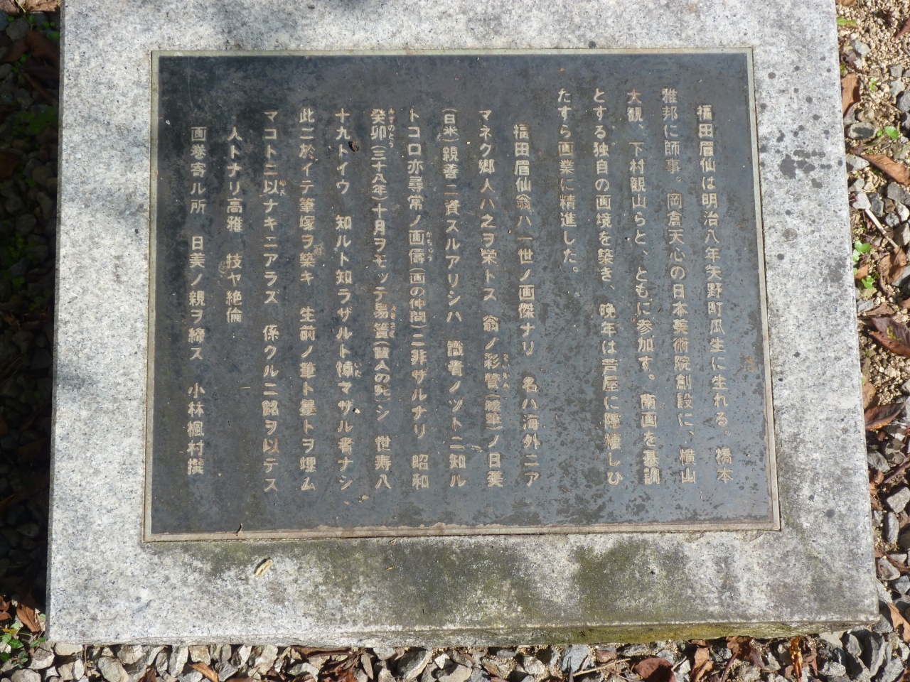 瓜生羅漢や羅漢渓谷は良く知られているが、渓谷の入り口で右側(川沿い)に大きな石で造られた「筆塚」がある。その塚には福田眉仙が永年愛用した筆十本と墨が納められている。眉仙は、横山大観はじめ多くの画の仲間がいてその新任の厚い人であったといわれている。地元の出身で郷土史家である小林楓村氏が撰文している。