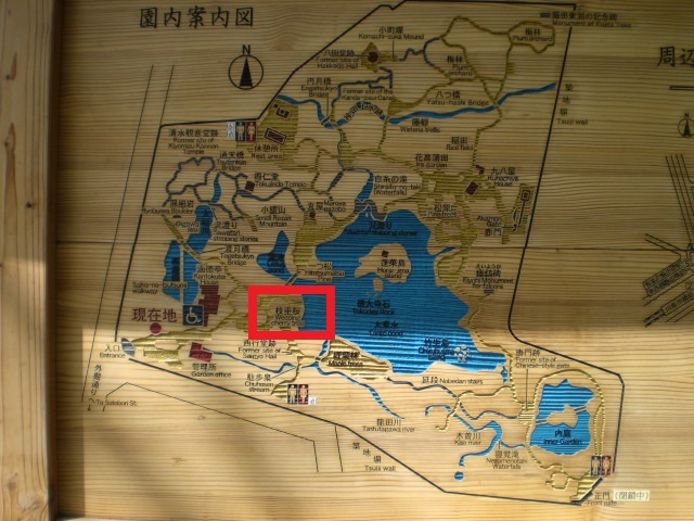 入口から入った正面にあるシダレザクラの開花が一番早く、次に正面のシダレザクラから渡月橋に向かう途中にあるシダレザクラが咲き、最後にその奧にあるピンクの桜が咲くとのことです。