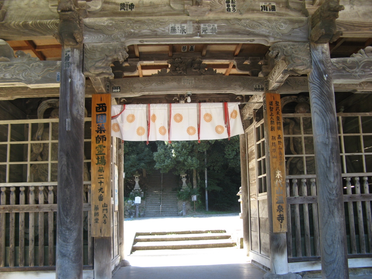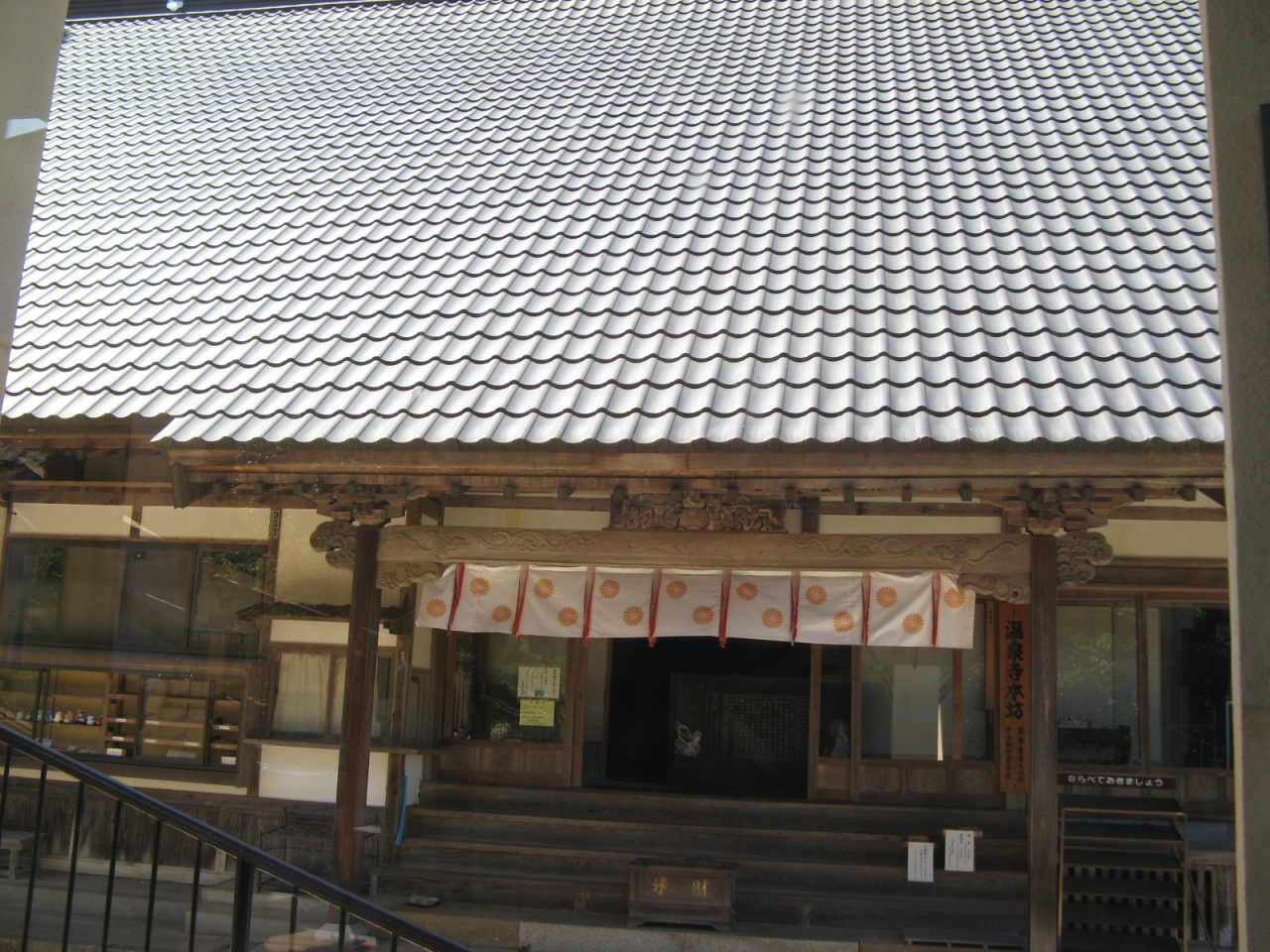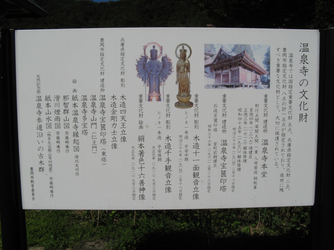 城崎ロープウェイで山頂駅まで行き、山頂から山道を歩いて下り温泉寺に参拝しました。頂上駅近くには温泉寺の奥の院、慈母観音像などがあり、そこから山道を15分ほど下って行くと温泉寺の本堂や多宝塔があり、さらに10分ほど下ると温泉寺の薬師堂や山門に至りました。