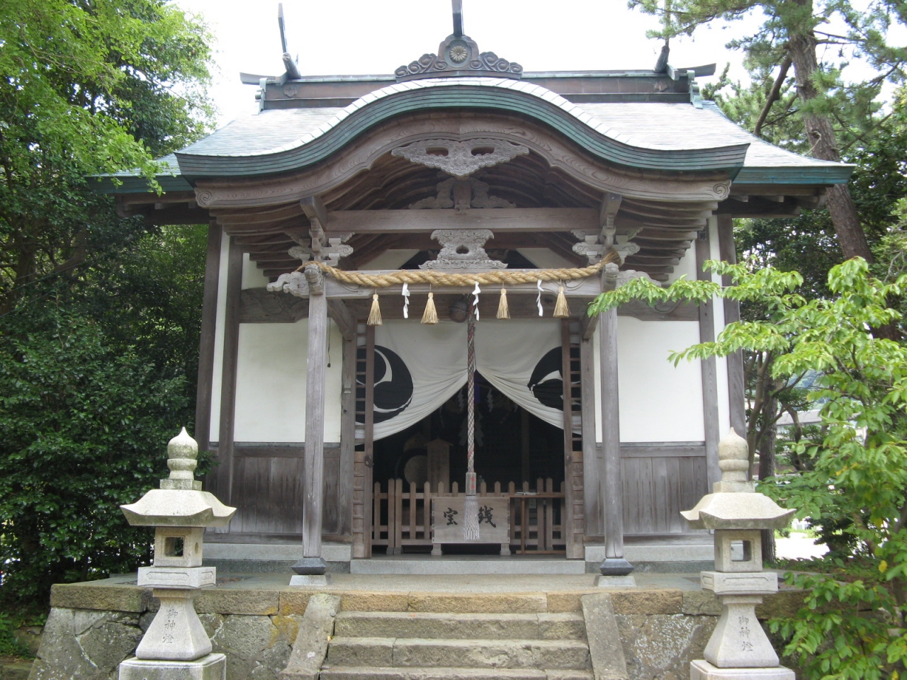 垣に囲まれた小さな境内、二つの鳥居をくぐった先に社殿があります。由緒書きには社殿について書かれていないので建築時期など詳細が判りませんでした。城崎マリンワールドのすぐそばという立地にあるのに訪れる観光客もいない小さな神社です。航海の神や社殿などについて説明書きがあればと思いました。