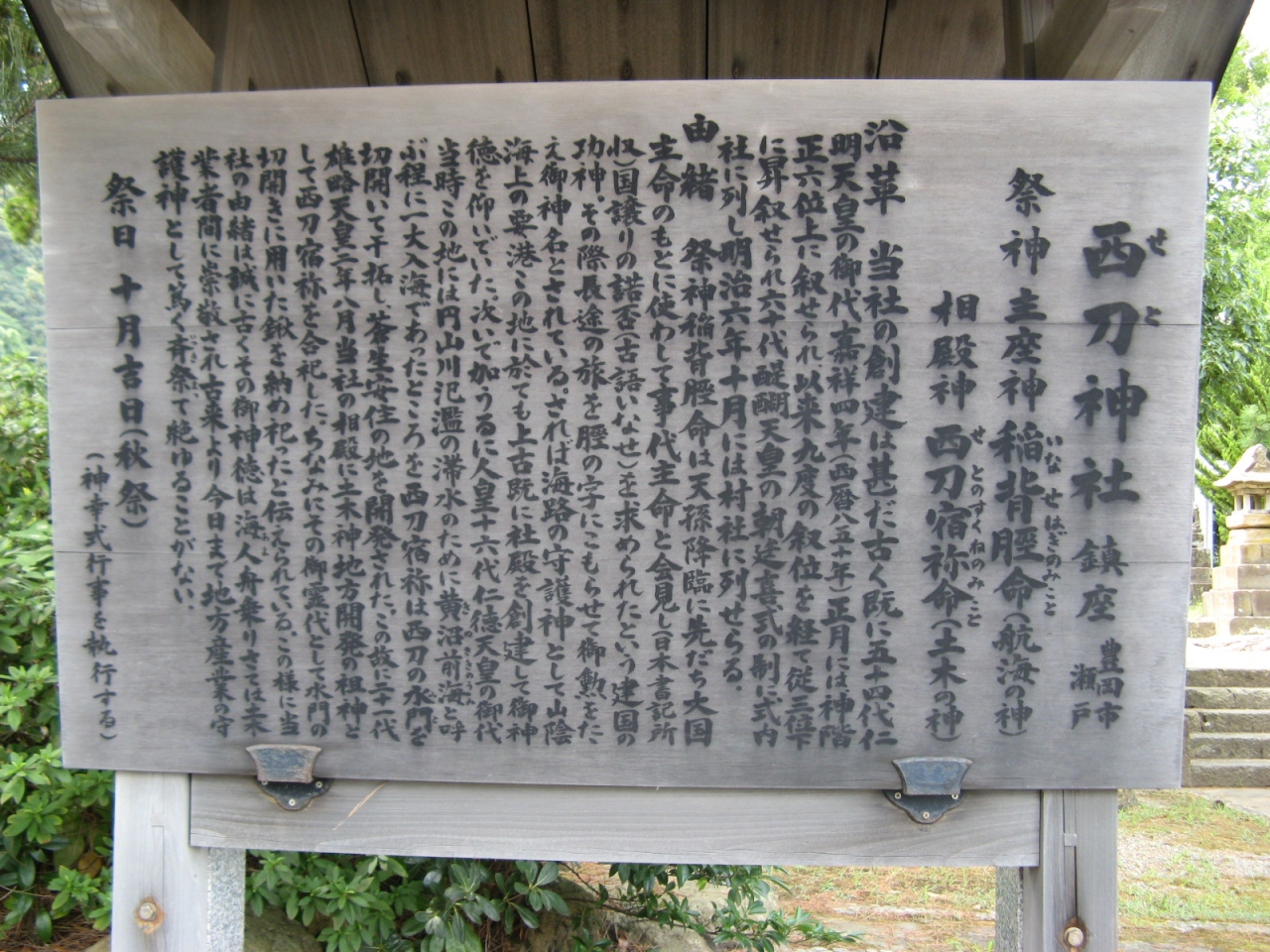 城崎マリンワールドのバス停の隣に鎮座されています。現地にある由緒書き(添付写真参照)によると、創建は850年という古社で、稲背脛命(いなせはぎのみこと・航海の神)と西刀宿袮命(せとのすくねのみこと・土木の神)をお祀りされている。西刀神社の社号は、円山川の治水工事を行ったという西刀宿禰命からきているようです。