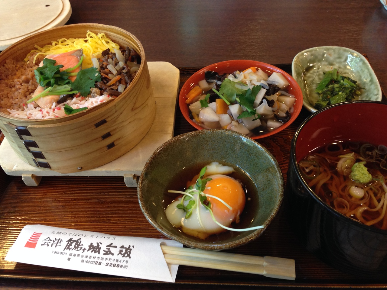 お食事処・二の丸にて昼食を取りました。せっかく会津に来たのでここでしか味わえない物をと、「わっぱ飯Aセット(会津の代表的郷土料理のわっぱ飯、ミニぶっかけ会津そば、会津地鶏半熟卵がセットになったメニュー)」と単品の「こづゆ(会津塗りの器で頂く具沢山の汁物)」を頂きました。