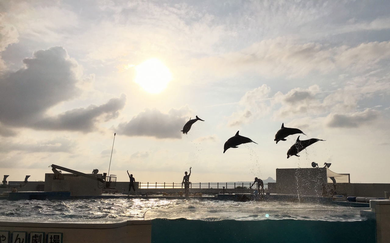 夕方の最終ショーを見学しました。夕日をバックにジャンプするイルカたちが素敵でした。