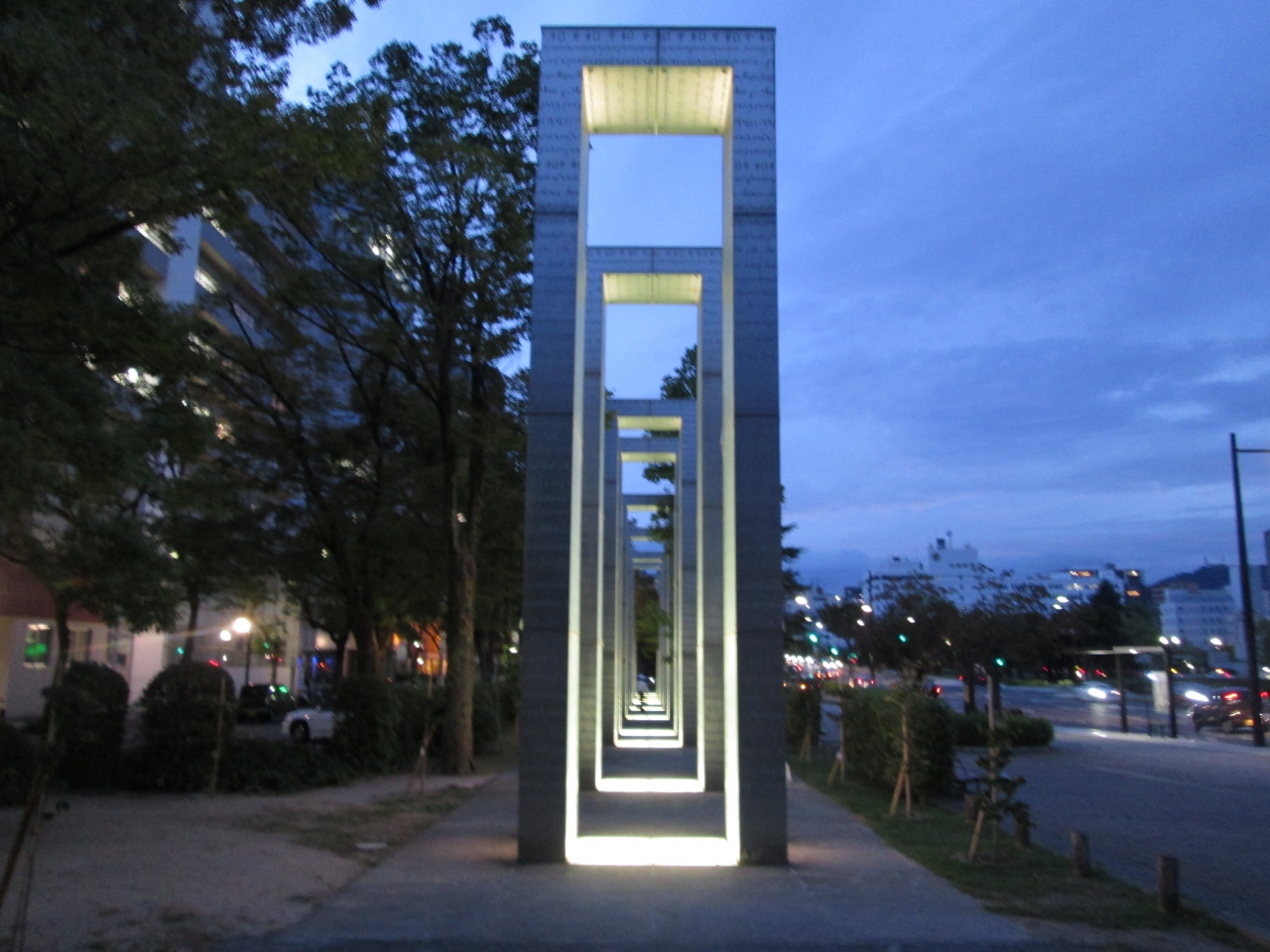 平和記念公園の外、平和大通りを挟んで平和の門が建っていました。高さ9m、幅2.6m、奥行き1.6mのガラス製10基の門が、東西75mにわたって、平和記念資料館の柱と平行に立ち並んでいました。公園内外には「平和」と名前が付いた建築物があり、戦争と平和のことを考えさせられる場所でした。