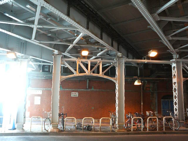 線路の下を斜めにくぐっていて、赤レンガの土台をつなぐように白い鉄骨が張り巡らされていて、黄色い照明に照らされると昼間でもちょっといい雰囲気でした。