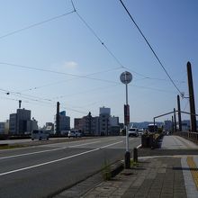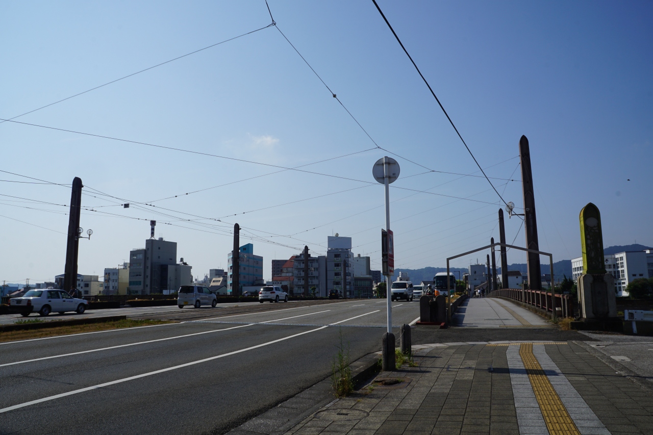 潮江橋は、はりまや橋交差点から桟橋通りに向かってすぐの橋。鏡川に架かって、市街電車も通る大きな橋です。ここからは、鏡川の向こうに筆山も見える見晴らしのいい眺め。のどかな景色ではあるのですが、高知は水害も多い街。ここも何度か氾濫しているのだと思います。