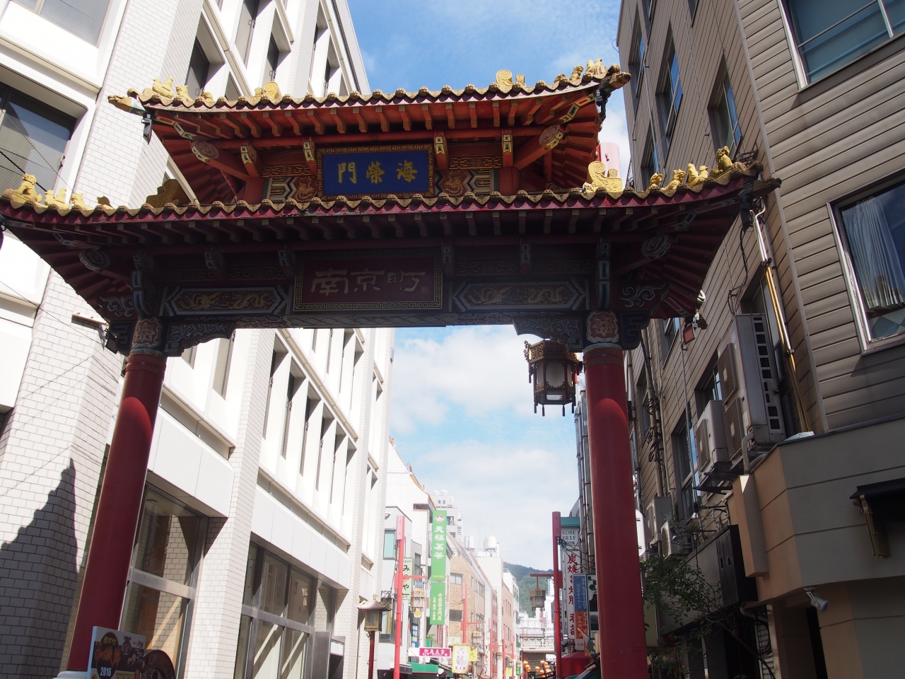 中華街(南京町)への南側にある門が南京町海栄門です。南京町には現在3つの門があります(残っています)が、こちらは3つの門のなかで一番簡素な感じです。門を入り北に向かって歩くと南京町広場に達します。ところで南京町の北門はありません。