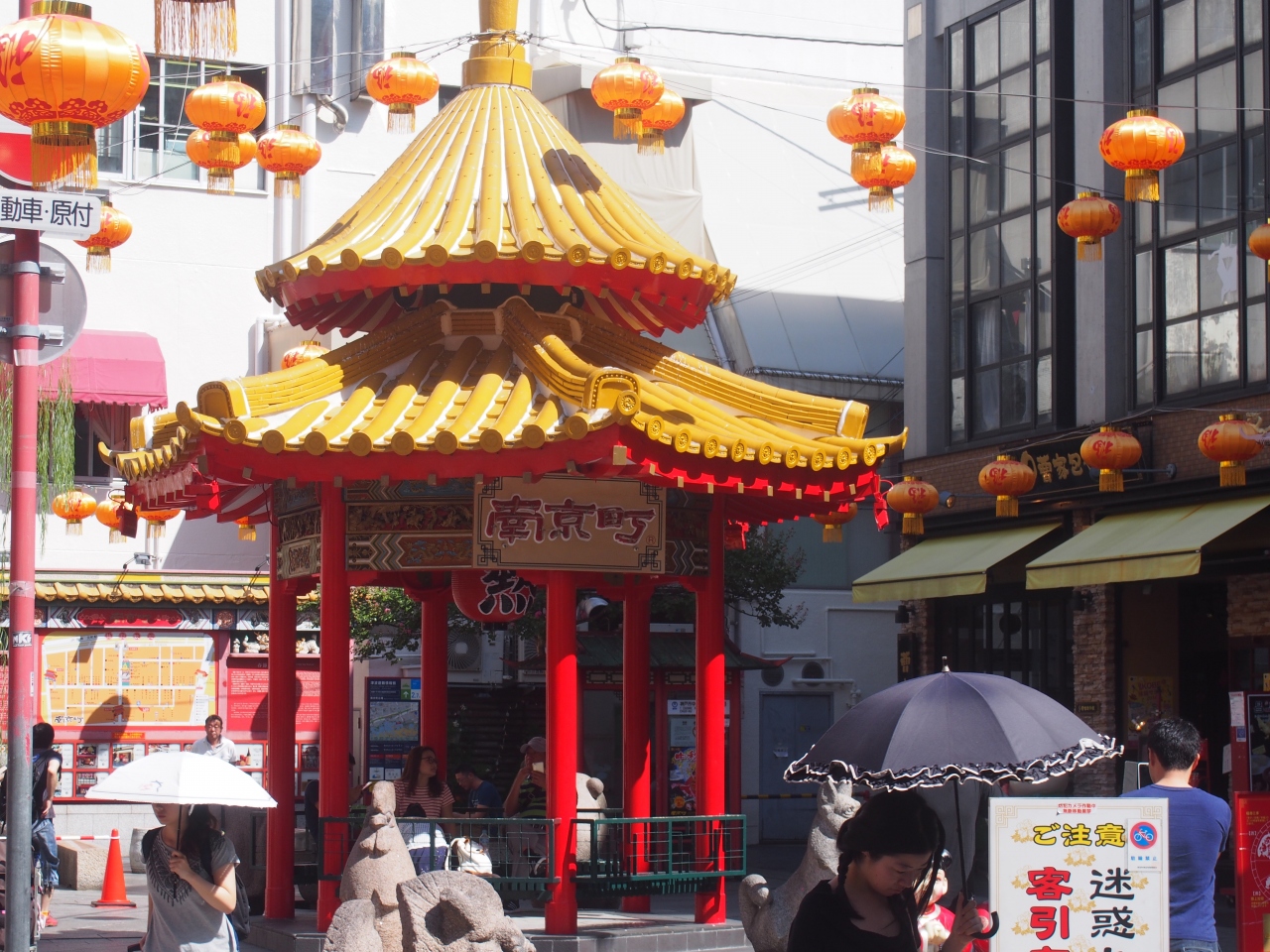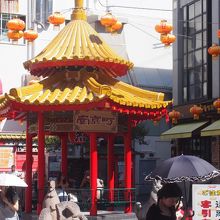 中華街(南京町)の中央部にある南京町広場のなかほどに東屋があります。東屋は赤や黄色などを使った中国風の建物です。広場の東屋近くには座る場所もあり待ち合わせ場所、休憩所になっています。広場の近くには人気の豚まんやなどがあります。