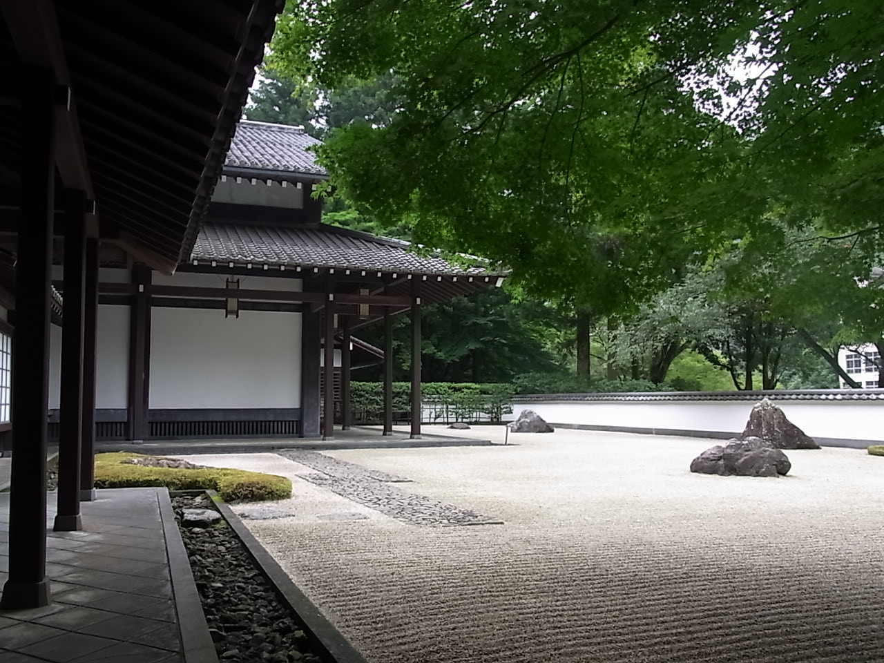 入ってすぐ左手に見える枯山水の白い玉砂利が清々しいです。