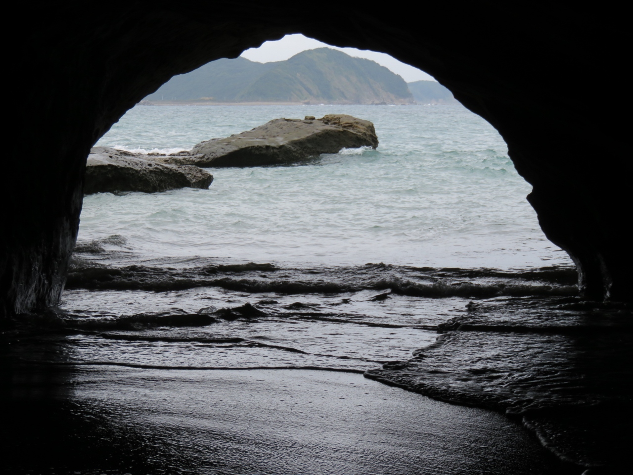 この洞内に入れるのは干潮の前後だけだと、私も誤解していた。ところが、現地に行ってわかったのは、堂内には後のほうからも2カ所入れる大きな穴があるのだ!堂内に前の砂浜のほうから入りたい時は、確かに干潮の時でないと無理だが、洞内見物は後に廻り込めばいい。洞内から海を眺める景色がいいのだ。