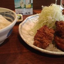 入口側にカウンター数席と奥にテーブル席。竜田揚げはとても大きなもも肉が4個、しっかりしょうが汁入のたれに漬かってるのでソースなしに食べられます。お皿にはこれまたボリュームたっぷりのキャベツがのってます。これだけで満腹。