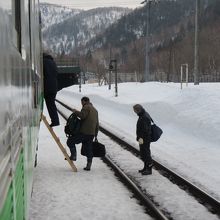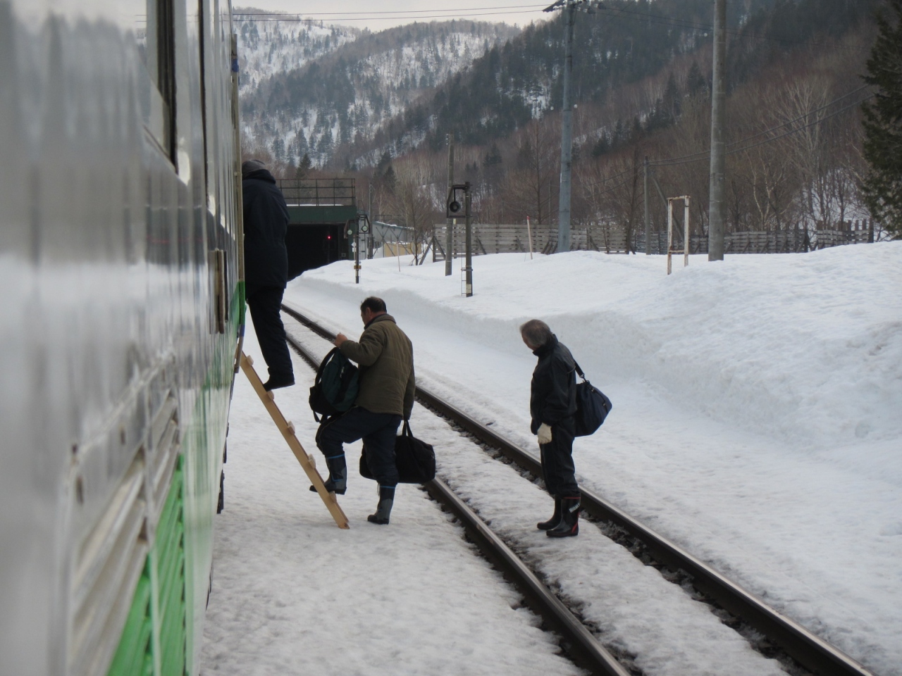 途中の信号所で乗務員が線路からハシゴで列車に乗ってきました。
