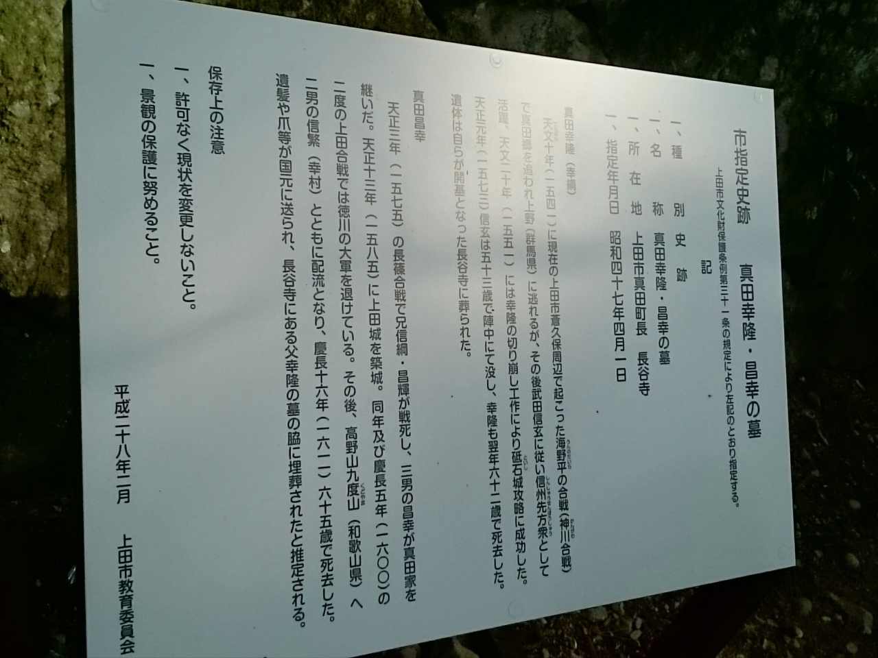 真田幸隆・昌幸の墓は、上田市の旧真田町である真田の郷、長谷寺(ちょうこくじ)にあります。